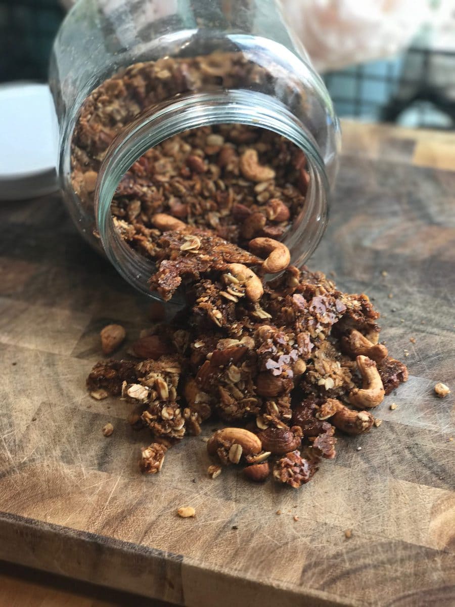 When I need a healthy sweet snack I often reach for a handful of granola and my kids follow suit. Even my toddler asks for it by name, pointing to the jar and saying “Nola, nola”.You can sub out for different types of nuts or dried fruits. Need a great little gift idea?Put it in a nice jar with a cute label or put it in a cellophane bag with a ribbon and this makes a great hostess gift or brunch party favor.